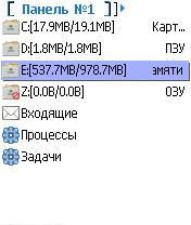 Новая версия хорошего файлового менеджера, обновление от 18.03.08 Особенности: - две панели, напоминает Total Commander для компа - полный контроль над файловой системой (копирование, вырезание, перемещение, вставка и удаление) - сортировка файлов по размеру, дате, расширению, UID - установка/снятие атрибутов - архивирование файлов в архивы GZIP - быстрая справка по наличию свободного места на диске - удобный поиск файлов - встроенный менеджер задач и процессов - информация о телефоне и сети - создание нового СМС - съемка скриншотов в форматах JPEG, GIF, BMP, PNG и MBM - монитор состояния оперативной памяти - быстрый доступ к папке входящих сообщений - управление по горячим клавишам