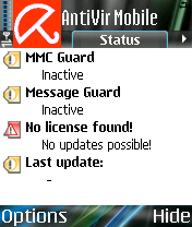 Язык - Англ., Нем. (на выбор при установке) Версия - 6.39.00.02 Состояние - Trial База вирусов: 310 Лицензия до: 25.15.2011 Версия ядра: 6.39.00.01 Установка: - Переместите из архива файл hbedv.key в папку с СМС сообщениями на вашем смартфоне (x/System/Mail) - После того как вы переместили файл с лицензией заходите в меню и выберите "licence" VDF-Update - Для апдейта VDF-файла (базы вирусов) переместите файл "mobile.vdf" из архива в корень диска C: (на ваш смартфон) - Запускаем AntiVir Mobile и выбираем пункт Update VDF из меню помощи.